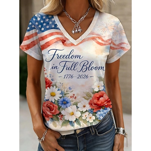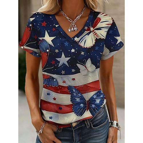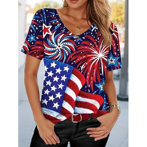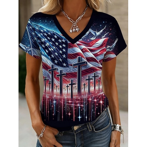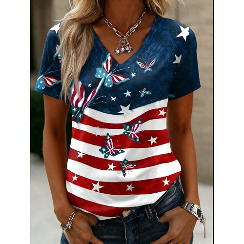 Amerikanischer Unabhängigkeitstag Damen T Shirt Druck Grafik Flagge Amerikanische Flagge Vintage Stilvoll Klassisch Kurzarm V Ausschnitt Normale Oberteile Täglich Indigo Weiß Marineblau Tintenblau
