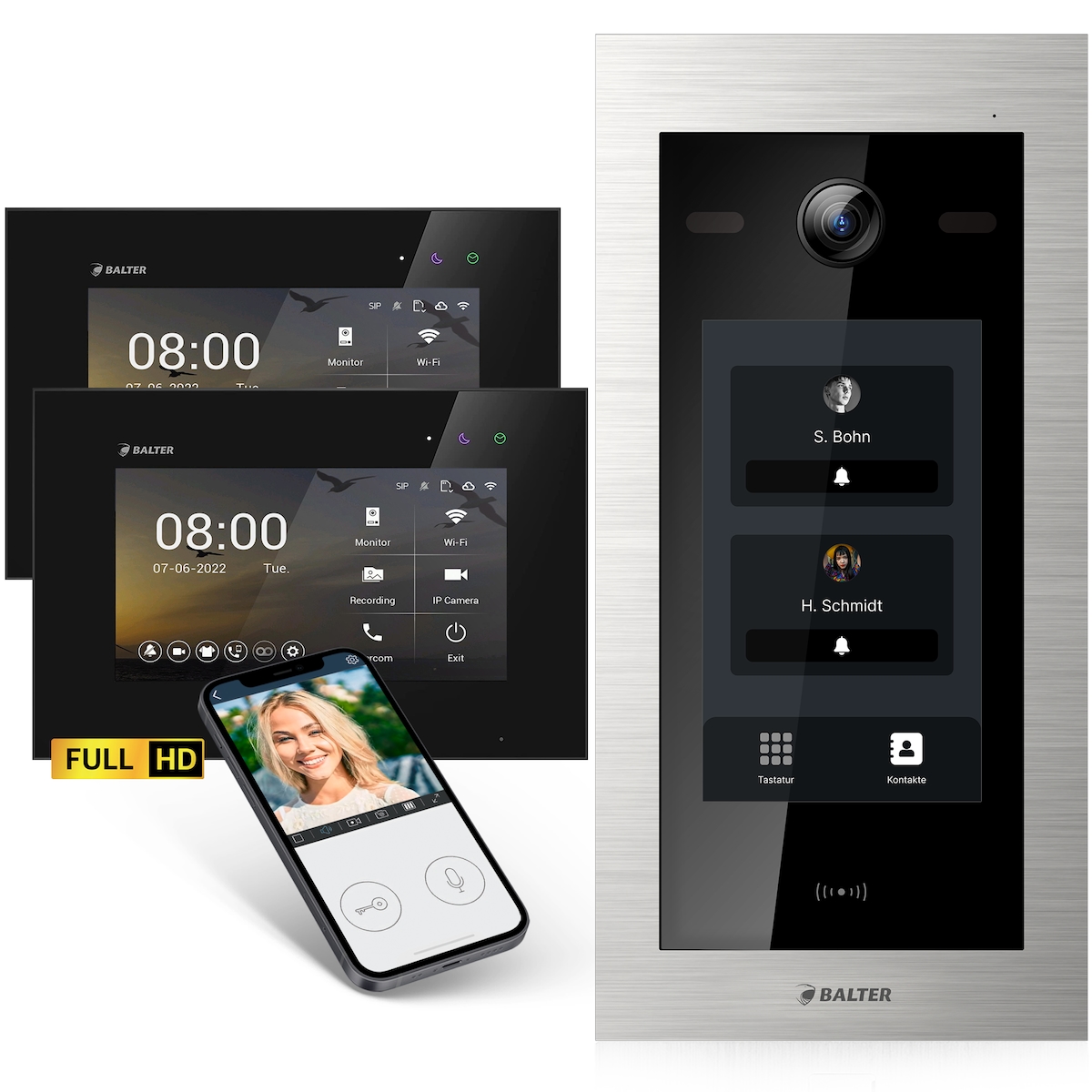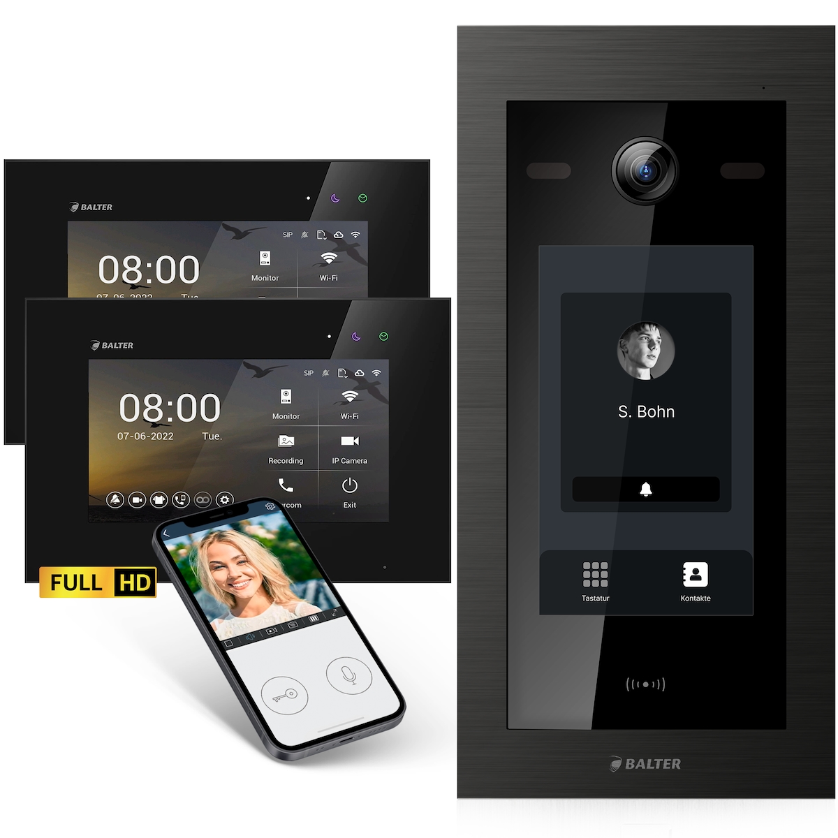 Balter EVO HD Video-Türsprechanlage 3x 7" Monitor Touchscreen 2-Draht BUS Komplettsystem für Einfamilienhaus