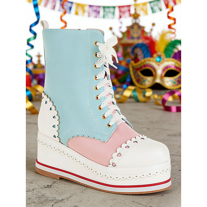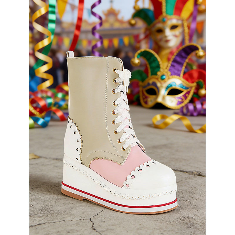 Women's Rose Pink Platform Wedge Boots with Scalloped Trim – Sweet Lolita Style Lace-Up Shoes for Anime Cosplay Carnival Parades