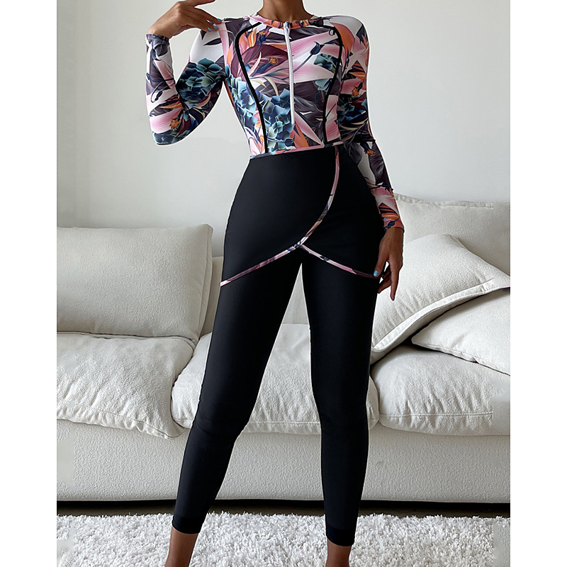 Women's Rash Guard Floral Print Swimsuit Bathing Suit Printed Ultra Light (UL) UV Protection Elastic Long Sleeve Swimwear Zip Up With Cover Up Surfing Snorkeling Winter