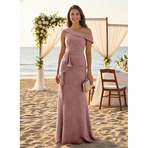 Linea ad A Lunghezza al pavimento Abito Formale Abito da sera Abito da cerimonia per signora Senza Maniche Monospalla Elegante Nascondi Pancia Formale Ospite di nozze Jacquard con Arricciato Volant