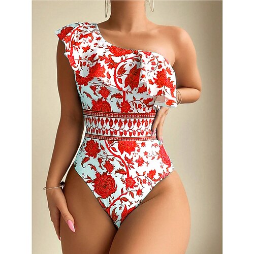 Per donna Costumi da bagno Intero Monokini Costume da bagno Volant Controllo della Pancia Vita alta Snello Senza schiena Vacanza Abbigliamento da Spiaggia Floreale Scollo a V Senza Maniche Costumi da