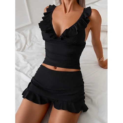 Per donna Costumi da bagno Tankini Due pezzi Gonna Costume da bagno Volant Controllo della Pancia Vita alta Snello Senza schiena Vacanza Abbigliamento da Spiaggia Tinta unica Scollo a V Senza Maniche