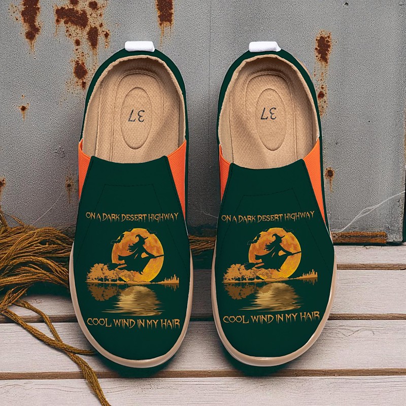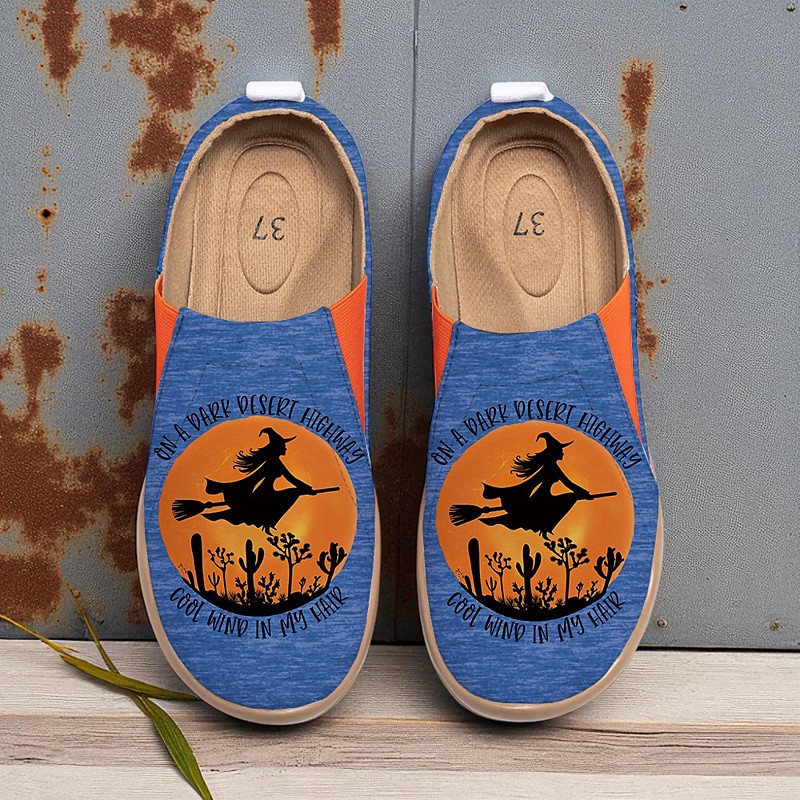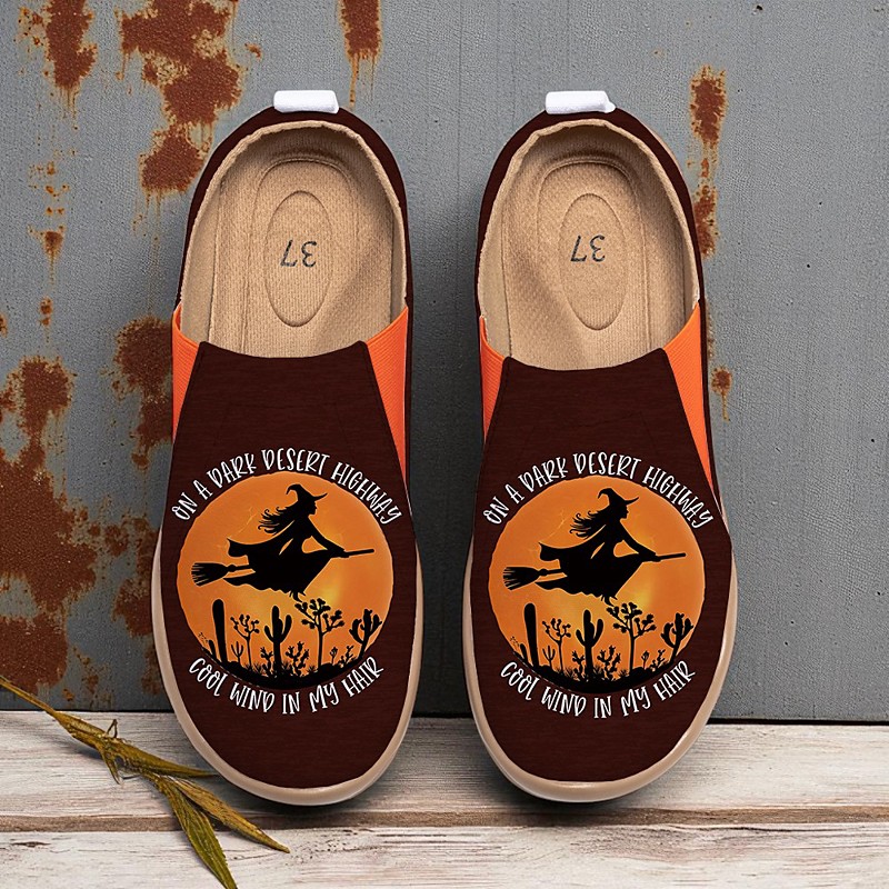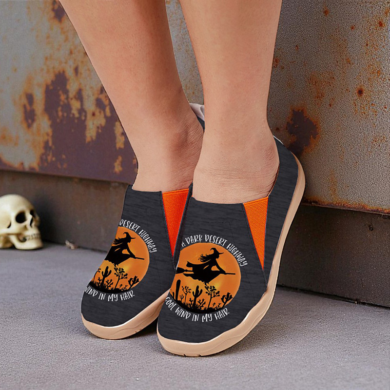 Women's Canvas Wide-Width Slip-On Shoes with Witch Flying Desert Sunset Print – Halloween Theme Flats for Parties, Festivals and Everyday Casual Wear