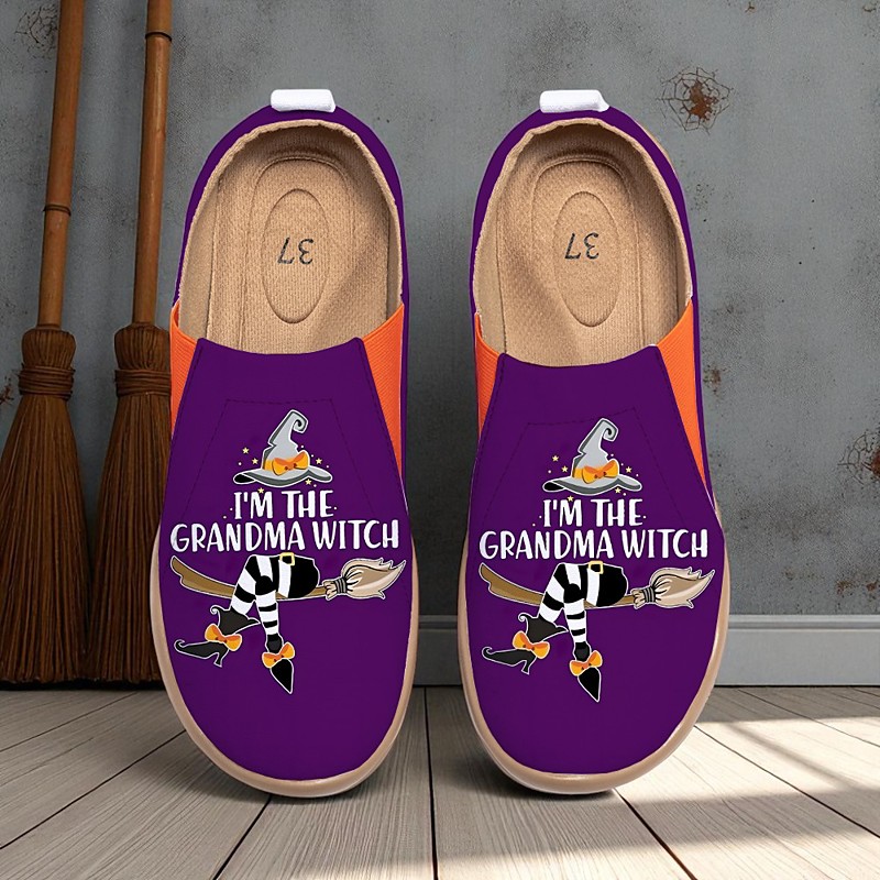 Women's Orange Wide Width Slip-On Casual Shoes with Funny Grandma Witch Print – Comfortable Halloween Footwear for Casual Wear, Walking and Travel